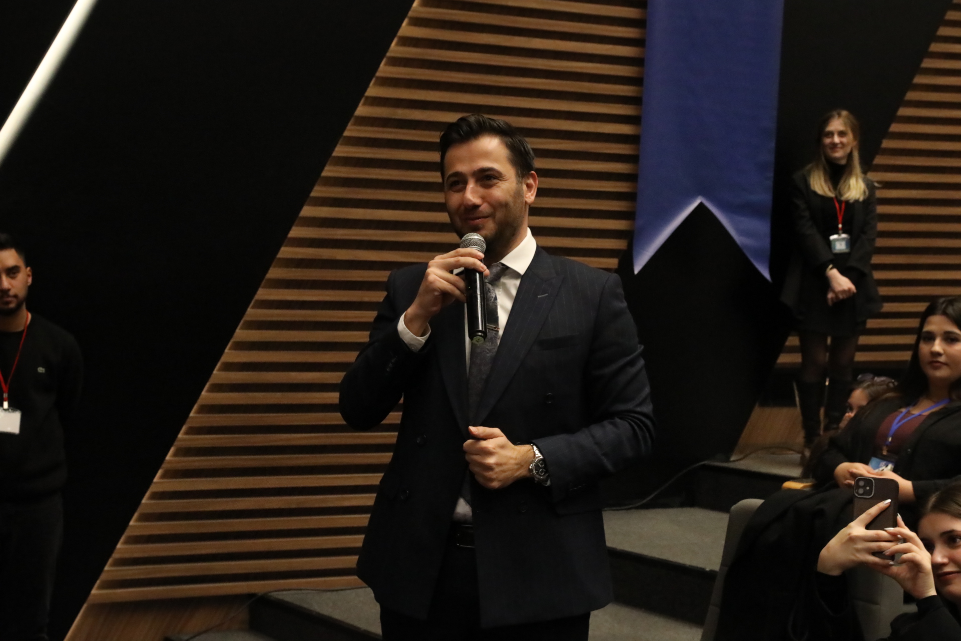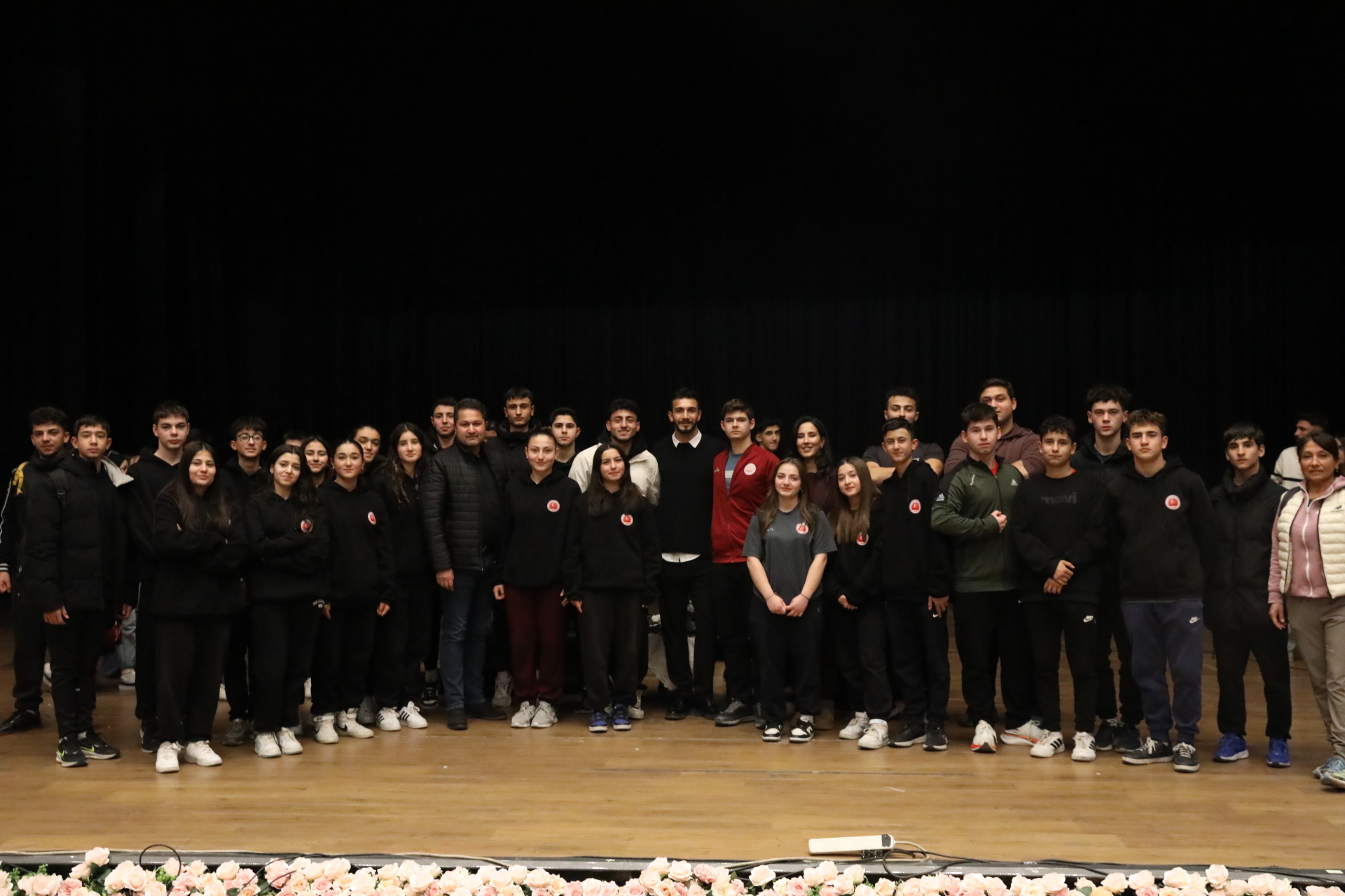 Söyleşi programı izleyicilerin sahnede geniş aile fotoğrafı ve bireysel çekimlerle sona erdi.
