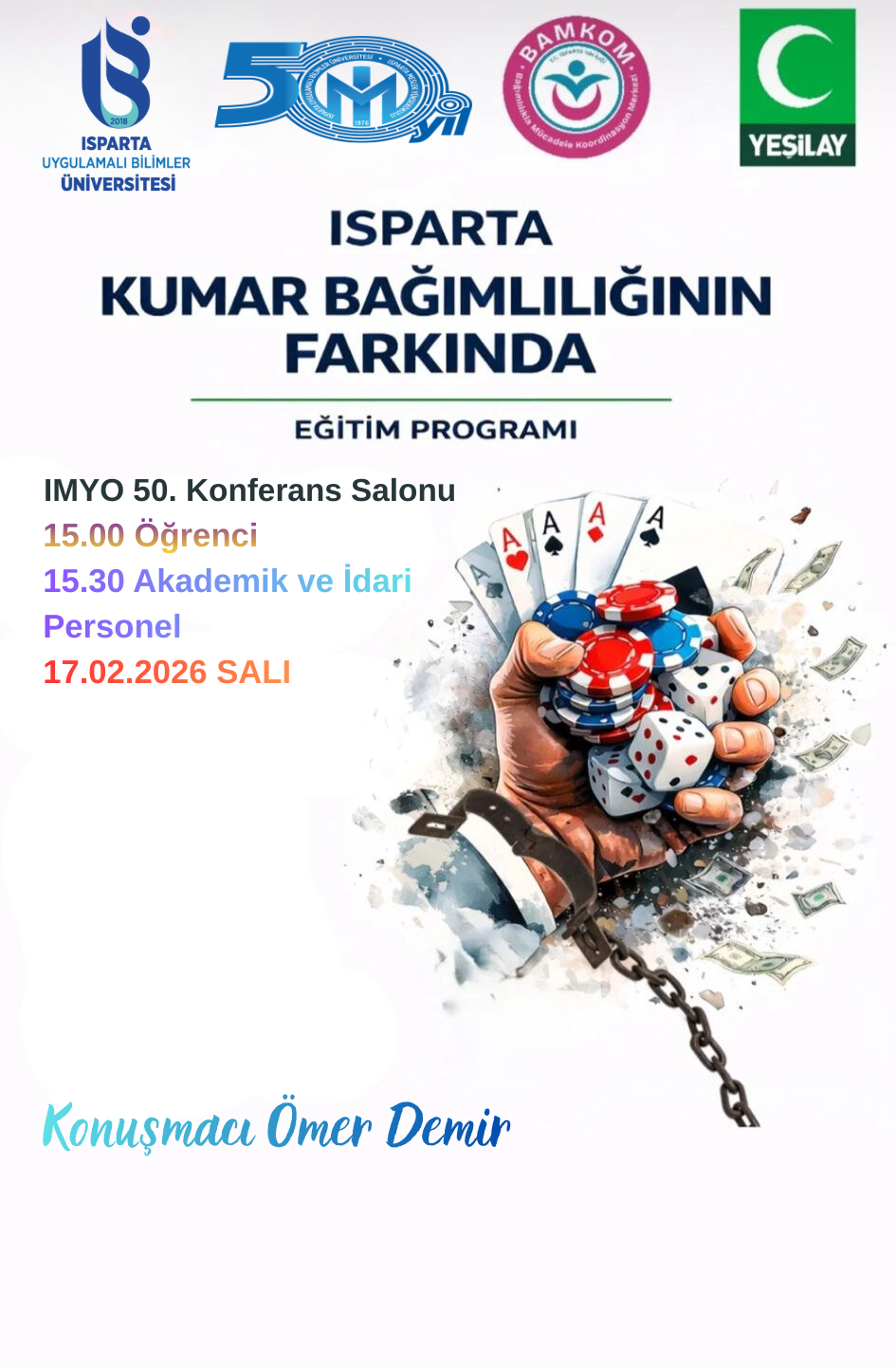 Isparta Valiliği koordinesinde Bağımlılıkla Mücadele Koordinasyon Merkezi (BAMKOM) tarafından yürütülen "Isparta Kumar Bağımlılığının Farkında" projesi kapsamında, Üniversitemiz Bağımlılıkla Mücadele Koordinatörlüğü bünyesinde koruyucu ve önleyici eğitim faaliyetleri planlanmıştır. Bu faaliyetin bir ayağı da Isparta Meslek Yüksekokulu akademik, idari personel ile öğrenciler için IMYO 50. Yıl Konferans Salonu'nda 17.02.2026 Salı günü saat 15.00'te başlayacak olup, art arda iki seans halinde düzenlenecektir. Konuşmacı Ömer Demir tarafından ilk seans 15.00'te öğrenciler için yapılmasının yanı sıra, ikinci seans 15.30'da akademik ve idari personelin eğitimi ile devam etmesi planlanmıştır.