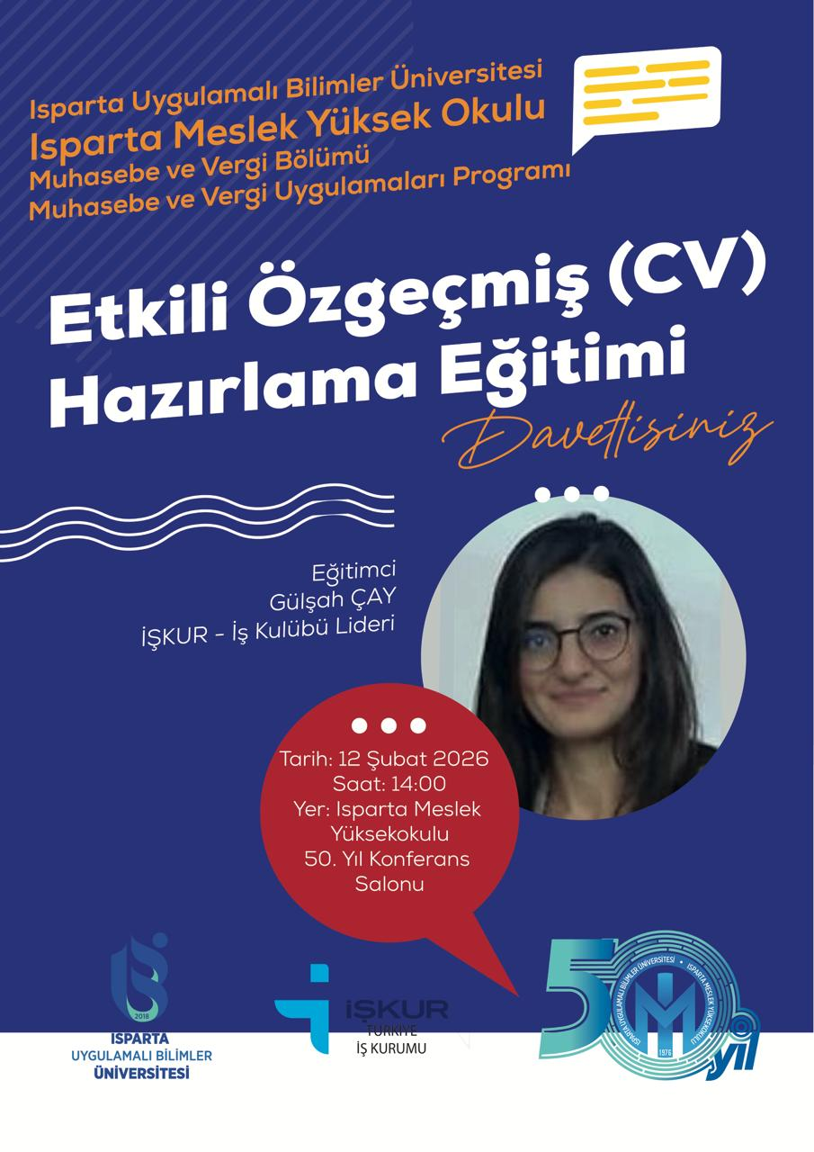 IMYO Muhasebe ve Vergi Uygulamaları Bölümü Etkili Özgeçmiş ve CV Hazırlama Eğitimi için İŞKUR Isparta İş Kulübü Lideri Gülşah ÇAY eğitim seminerini IMYO 50. Yıl Konferans Salonu'nda 12.02.2026 Perşembe günü saat 14.00'te düzenlenecektir.