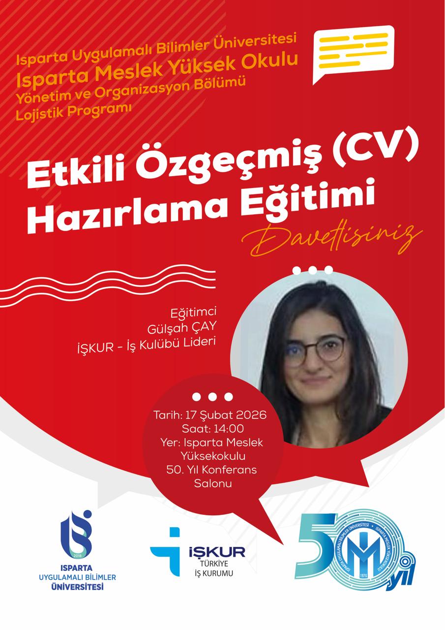 IMYO Yönetim Organizasyon Bölümü Lojistik Programı Etkili Özgeçmiş ve CV Hazırlama Eğitimi için İŞKUR Isparta İş Kulübü Lideri Gülşah ÇAY eğitim seminerini IMYO 50. Yıl Konferans Salonu'nda 17.02.2026 Perşembe günü saat 14.00'te düzenlenecektir.